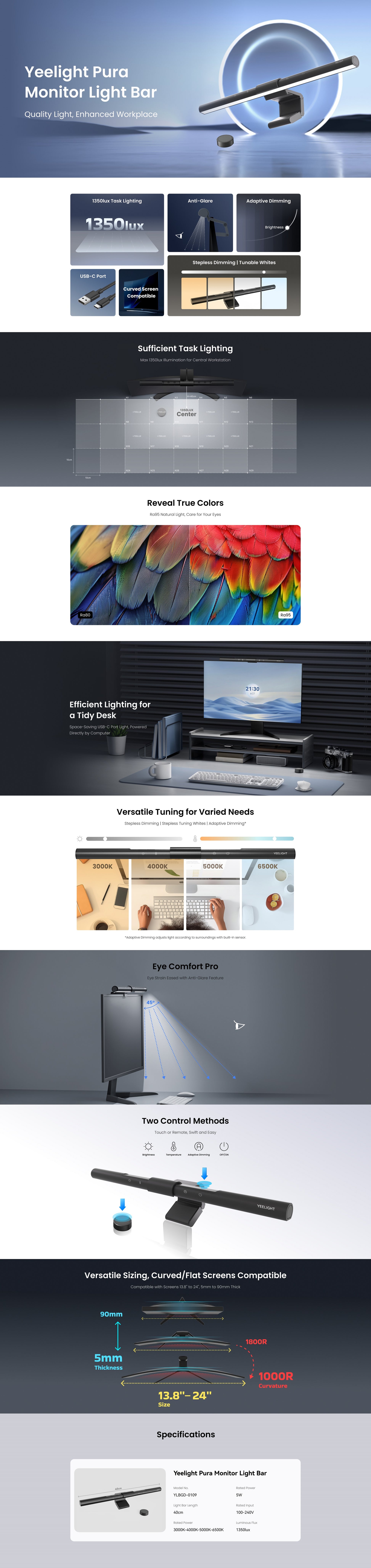 The Yeelight Pura Monitor Light Bar is a sleek, USB-C powered monitor lamp designed to enhance your workspace with optimal lighting. It features adjustable color temperatures ranging from 3000K (warm light) to 6500K (cool light) and a luminous flux of up to 1350 lumens. The built-in sensor automatically adjusts brightness based on ambient conditions, ensuring reduced eye strain during prolonged computer use. Compatible with screens from 13.8 to 24 inches and thicknesses between 5 to 90 mm, including curved monitors (1000R–1800R), it offers easy installation and control via a button or remote.